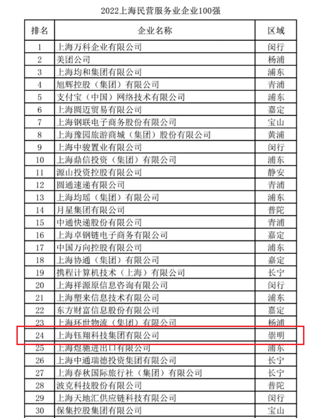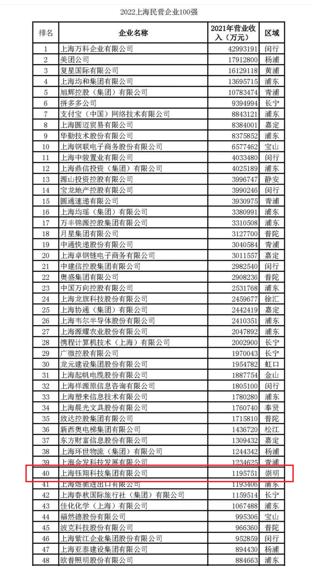 上海鈺翔科技集團有限公司憑借卓越的綜合實力、持續(xù)提升的科技創(chuàng)新能力,2021年實現(xiàn)營業(yè)收入119.5億元,榮獲“2022上海企業(yè)100強第88名”、“2022上海民營企業(yè)100強第40名”、“2022上海服務業(yè)企業(yè)100強第46名”、“2022上海民營服務業(yè)企業(yè)100強第24名”四項榮譽。
