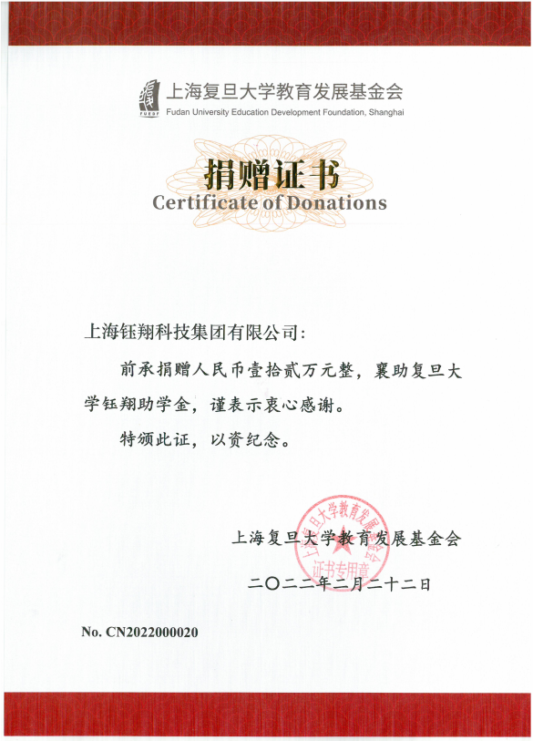 上海復旦大學教育發展基金會12萬元捐贈證書