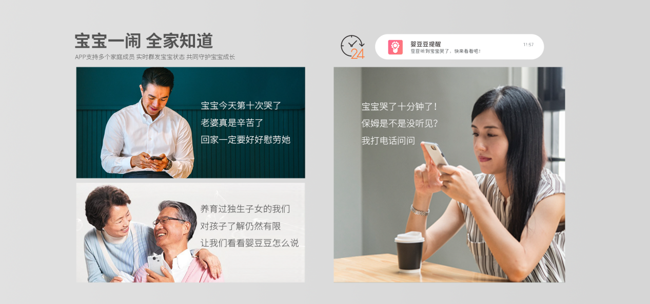 于是我們繼續搜索帶有寶寶監護功能的其他產品,發現了一款叫做嬰豆豆的智能親子燈,了解了它的功能后,我們就像發現了新世界一樣——這簡直就是為我們量身定做的一款產品!它是一個臺燈的形態,不會像攝像頭一樣可能窺探隱私,可以像裝飾品一樣放在床頭柜上。它不僅能實時監測寶寶的哭鬧現象,還能將哭鬧信息推送到父母手機上。有了它,以后我無論上班或是出差,都能知道BB在家“鬧騰”的情況,“能實時感知媳婦大人的不易。